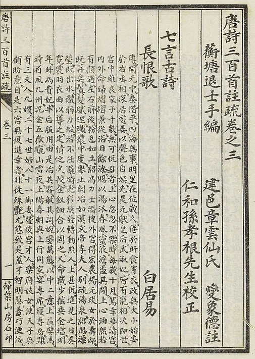 5.'장한가'는 공식적으로 한(漢)나라 무제(武帝,제7대 황제) 유철(劉徹, BC 156~BC 87)과 이부인(李夫人)의 고사를 바탕으로 썼다. 그래서 첫머리부터 대뜸 '한나라 황제'(漢皇)로 시작한다. 하지만 '양씨 가문의 딸', (양귀비가 자결한) 마외(馬嵬), 양귀비의 도사 시절 호인 '태진'(太眞), 장안(長安) 등이 나와 시의 주인공이 누군지 선명하게 밝히고 있다.